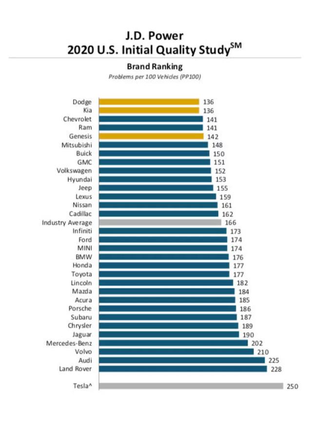 (觀察者網 文/秋水 編輯/徐喆)對於購買新車的消費者來説,權威機構的調查報告是一項重要的參考工具。美國著名市場研究和諮詢公司君迪(J.D. Power)日前發佈了美國2020年新車質量調查報告。從報告排名來看,前三名分別是道奇、起亞和雪佛蘭,而新車質量墊底的五大品牌則分別為奔馳、沃爾沃、奧迪、路虎和特斯拉。