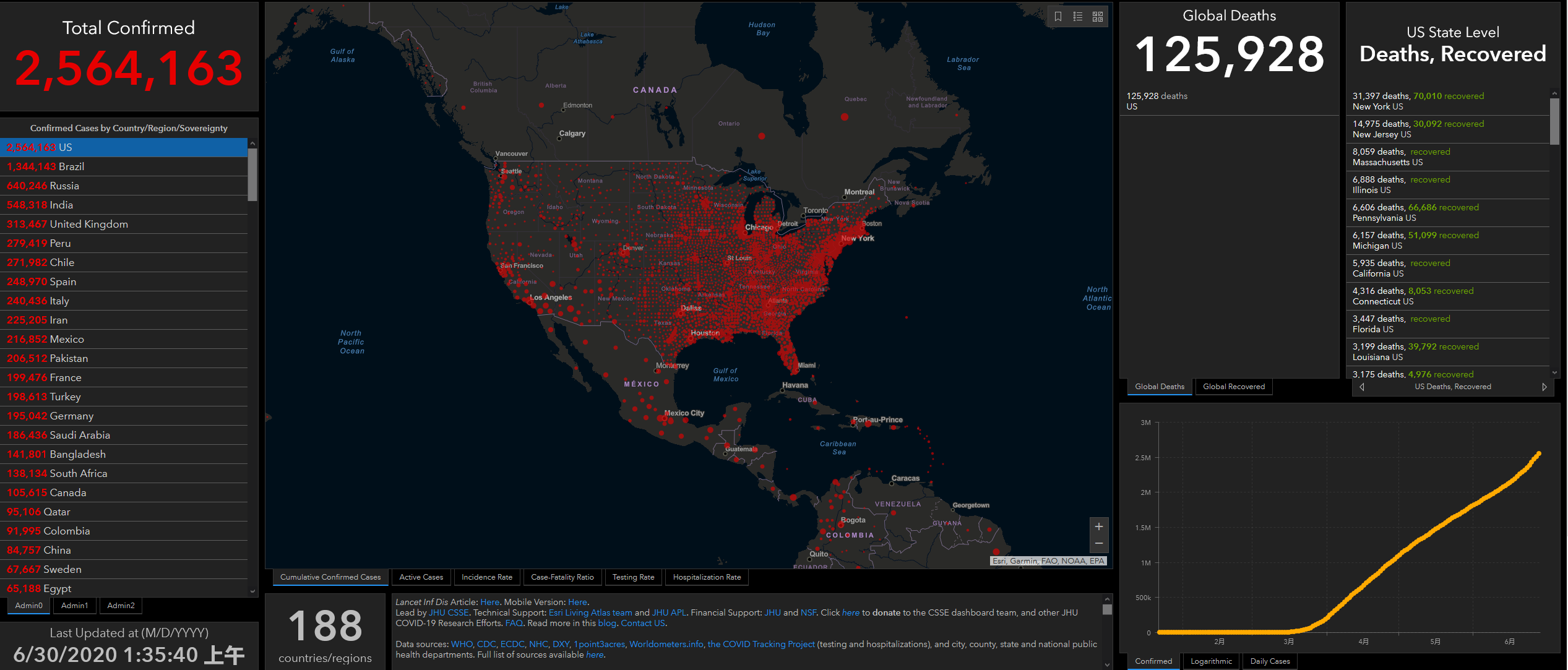 (觀察者網訊)約翰斯·霍普金斯大學發佈的新冠疫情最新統計數據顯示,截至北京時間6月30日凌晨1時35分(美東時間6月29日13時35分),美國新冠肺炎累計確診病例2564163例;死亡病例達125928例。