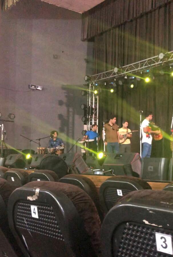 JAVN這天晚上的演出在阿瓦士的一個劇場,外部看起來還馬馬虎虎,而進入劇場內部,無論那油膩擁擠的場地,破舊老化的座位還是糟糕的電路燈光都讓我印象深刻。其實説是劇場都有點誇張,想象一下國內三線城市下屬鄉鎮數年前的小電影院。我走在後台都不敢使勁跺腳,害怕一個不小心把枱面踩出個洞。
