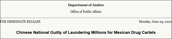 一中國公民“為墨西哥販毒集團洗錢超400萬美元”在美認罪