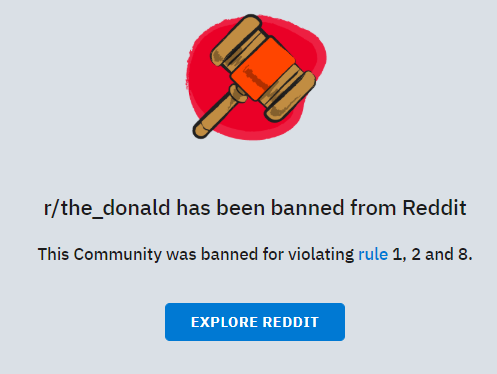 伴隨着Reddit官方對於“仇恨言論”政策的一系列改革,特朗普支持者們建立的社區(或稱子版塊,Subreddit)“r/The_Donald”被封禁。