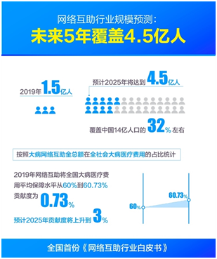 “花小錢治大病”的網絡互助模式收穫了國人的廣泛認同。據螞蟻金服研究院發佈的《網絡互助行業白皮書》顯示,2019年我國各類網絡互助平台的實際參與人數為1.5億,預計2025年將達到4.5億人,覆蓋中國14億人口的32%左右。