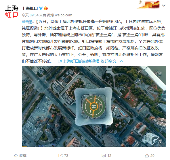 6月30日,上海市虹口區新聞辦官方微博闢謠稱,近日,網傳上海北外灘拆遷最高一户賠償6.8億,上述內容與實際不符,純屬捏造!