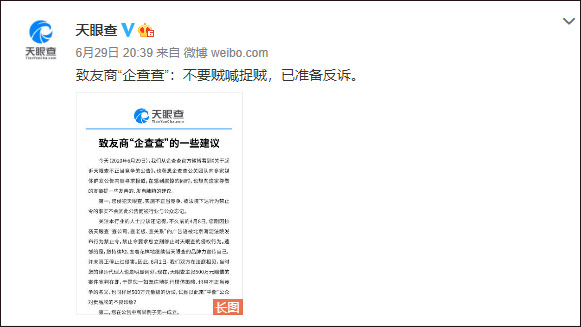 (文/觀察者網 一鳴)6月30日消息,針對6月29日下午企查查發佈《關於起訴天眼查不正當競爭的公告》,天眼查也在其官方微博發佈《致友商“企查查”的一些建議》進行回應。回應稱,企查查在公告中所舉例子無一成立,“不要賊喊捉賊,已準備反訴。”