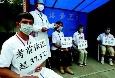 而早在5月底,各個省市就輪番開展了高考防SARS演練,從全副武裝的防治疫情專用車、到烈日下被防護服裹得嚴嚴實實的防疫人員、再到遍佈大街小巷的排查室,整個國家在不到兩個月裏,完成了一次為高考準備的緊急動員。