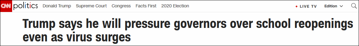 CNN的報道稱,對於全美學校的大面積關閉和停課,特朗普一直都認為這是出於某些“政治因素”,而始作俑者就是民主黨人。他表示,民主黨不希望學校在秋季開學是因為“政治原因”,絕非是因為“健康原因”,關閉學校在政治上對他們有利。