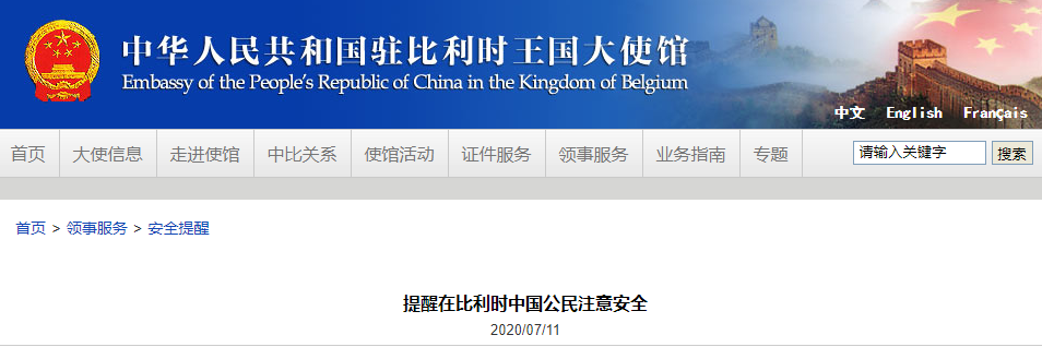 中國駐比利時大使館7月11日發佈消息,提醒在比利時中國公民注意安全。