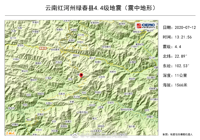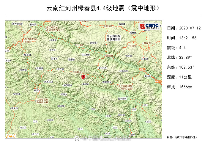 中國地震台網正式測定:07月12日13時21分在雲南紅河州綠春縣(北緯22.89度,東經102.53度)發生4.4級地震,震源深度11千米。