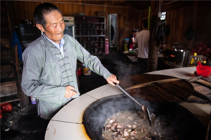 在湘西十八洞村,82歲的施成富在自家的農家樂裏炒臘肉(6月29日攝)。新華社記者 陳思汗 攝