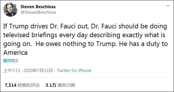 一名網民表示:“如果特朗普‘驅逐’了福奇,那麼福奇應該每天做電視簡報,準確描述發生的情況。他不欠特朗普的,但他對整個美國負有責任。”