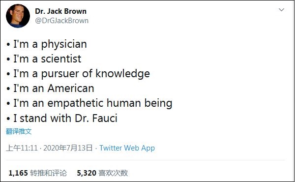 還有一人則簡短有力地表示:“我是個醫生。我是個科學家。我追逐知識。我是個美國人。我富有同情心。我和福奇站在一起。”