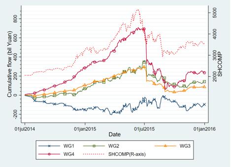 接下來,我們為不同的財富組計算流量及交易產生的收益和損失,如圖2,以相同初始持有量的買入持有投資者作為基準。從2014年7月到2015年12月,收入最低的85%的投資者損失超過2500億人民幣,而在這18個月期間,收入最高的0.5%的家庭卻獲得高達2540億回報。