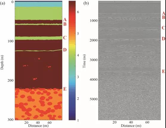 圖1 (a)中心頻率為60MHz的雷達圖像;(b)經過圖像增強的結果(五層界面分別標記為ABCDE);(c)根據雷達圖像得到的地質解譯結果(包括0-35米由二通道雷達補充的數據)