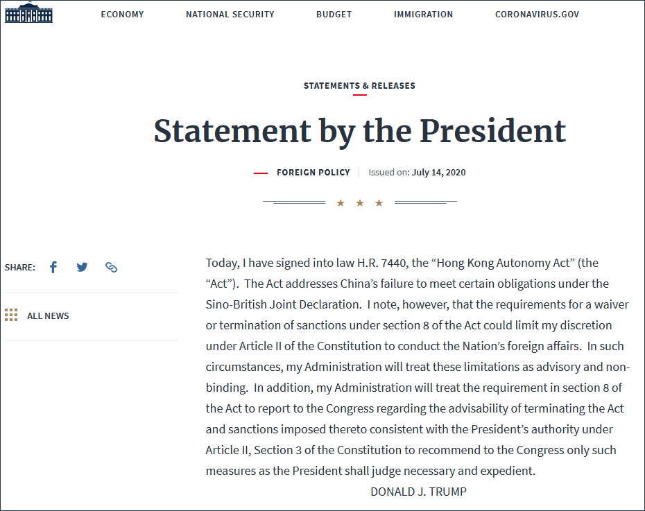 據美國消費者新聞與商業頻道(CNBC)報道,當天在白宮玫瑰園舉行的新聞發佈會上,特朗普將該法案稱作“政府強有力的工具”,還揚言自己已經簽署行政命令,“終結香港長期享有的優惠待遇”,將香港和中國內地“一視同仁”。