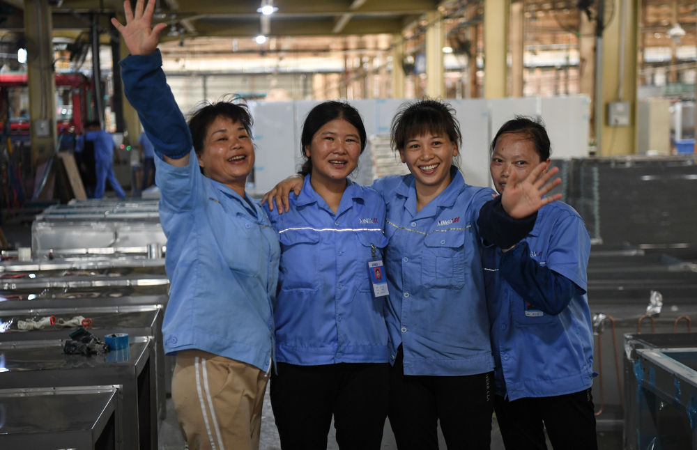 在佛山市三水區廣東星星製冷設備有限公司車間內,來自四川涼山彝族自治州鹽源縣的何公各(左二)和工友們合影(6月22日攝)。新華社記者 鄧華 攝