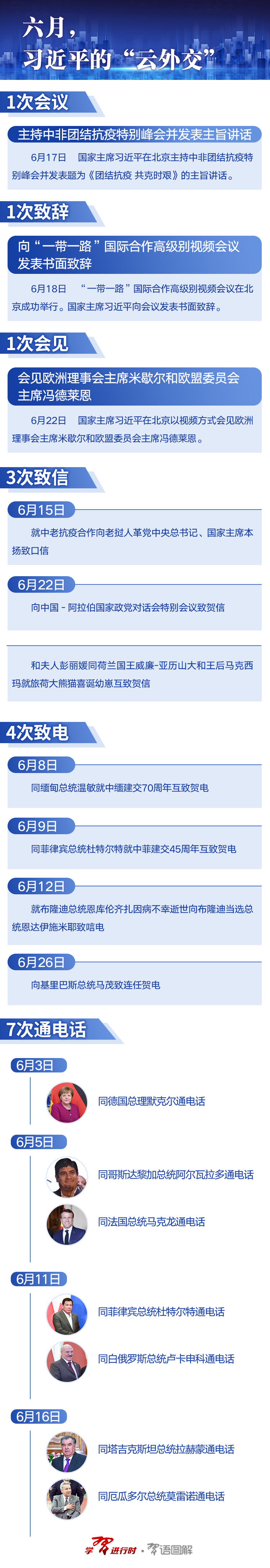 6月,習近平同德國總理默克爾、法國總統馬克龍、哥斯達黎加總統阿爾瓦拉多等外國領導人通電話;向中國-阿拉伯國家政黨對話會特別會議致賀信;以視頻方式主持中非團結抗疫特別峯會、會見歐洲理事會主席米歇爾和歐盟委員會主席馮德萊恩……