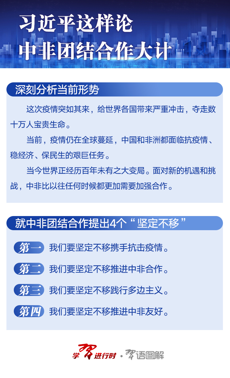 17日,習近平在中非團結抗疫特別峯會上提出四個“堅定不移”,指明瞭疫情形勢下中非抗疫及務實合作的前行路徑,指明瞭中非關係發展的未來方向。
