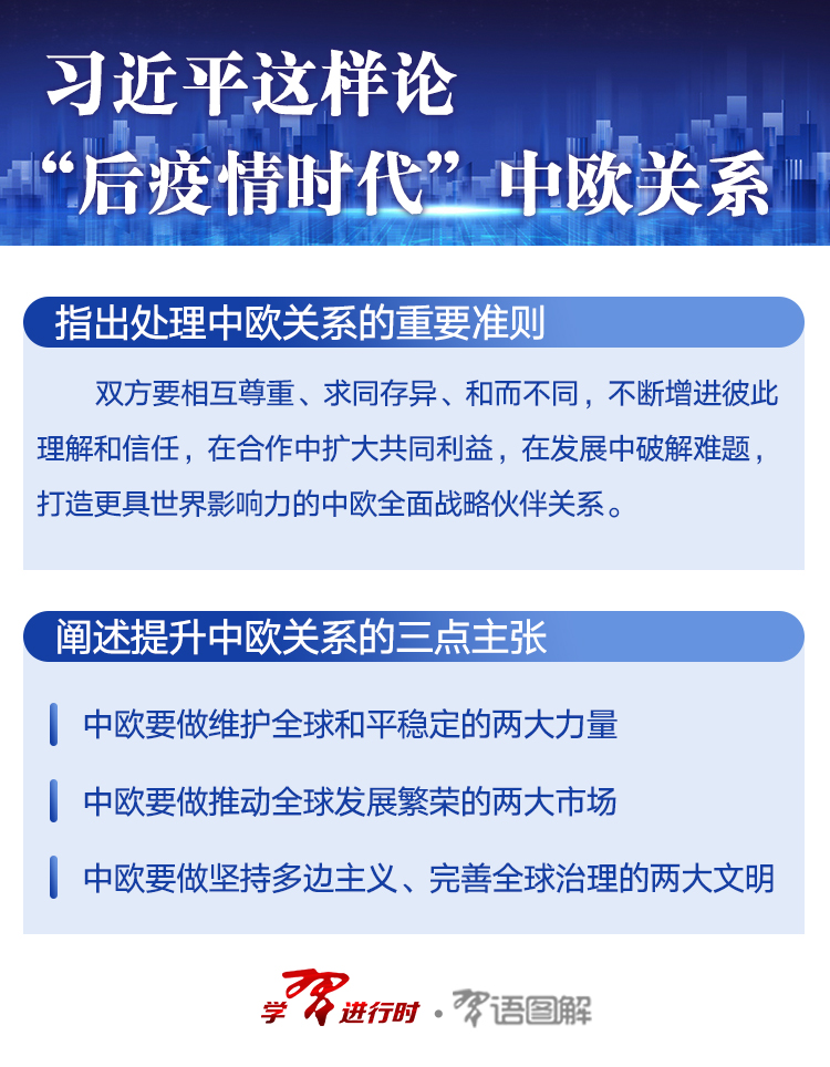 22日,習近平以視頻方式會見歐洲理事會主席米歇爾和歐盟委員會主席馮德萊恩時,提出中歐“要做維護全球和平穩定的兩大力量”“要做推動全球發展繁榮的兩大市場”“要做堅持多邊主義、完善全球治理的兩大文明”三點重要主張,為推動“後疫情時代”中歐關係在合作中擴大共同利益指明瞭方向。