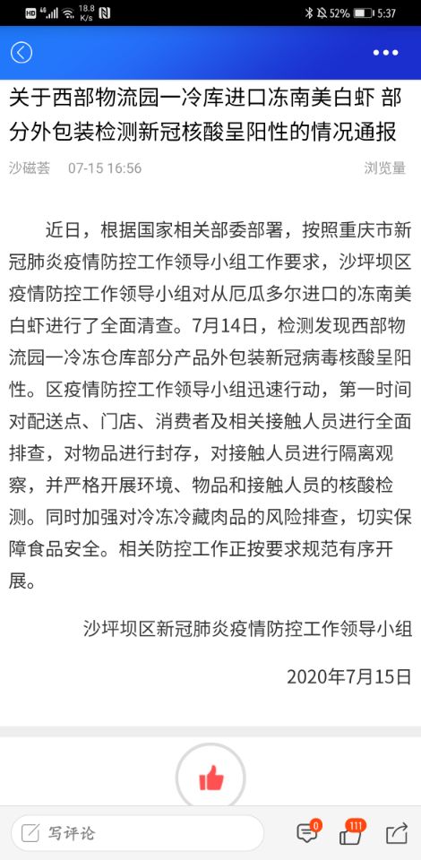 重慶市沙坪壩區官方APP“沙磁薈”7月15日發佈《關於西部物流園一冷庫進口凍南美白蝦 部分外包裝檢測新冠核酸呈陽性的情況通報》,以下為通報全文: