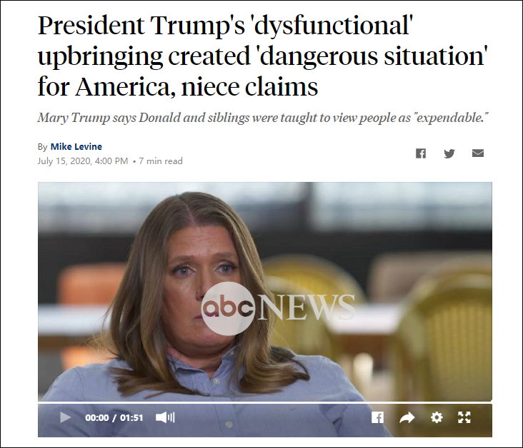 “他完全沒有能力領導這個國家,讓他這麼做是危險的。”瑪麗·特朗普在14日的採訪中對ABC新聞主播説,特朗普自小在一個“不正常(dysfunctional)”的家庭長大,堅信“金錢代表”愛的行為。他的父母還將自己家人當作“棋子”。