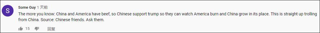 在上述應援視頻的留言區,也有熱心網友前來解釋,中國人支持特朗普,是因為特朗普會讓美國衰落,反而讓中國茁壯成長,“這是來自中國的惡搞,來自於中國朋友,問問他們吧。”