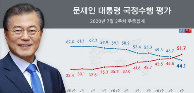 民調顯示的今年5月至今民眾對文在寅積極評價(藍線)和消極評價(紅線)走勢