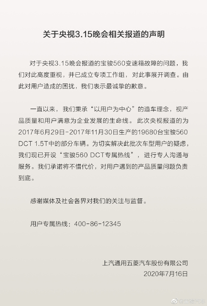 寶駿汽車通過官方微博回應稱:對於央視3·15晚會報道的寶駿汽車560變速箱故障的問題,我們對此高度重視,並已成立專項工作組,對此事展開調查,現已開設“寶駿560 DCT專屬熱線”,由此對用户造成的困擾,表示最誠摯的歉意