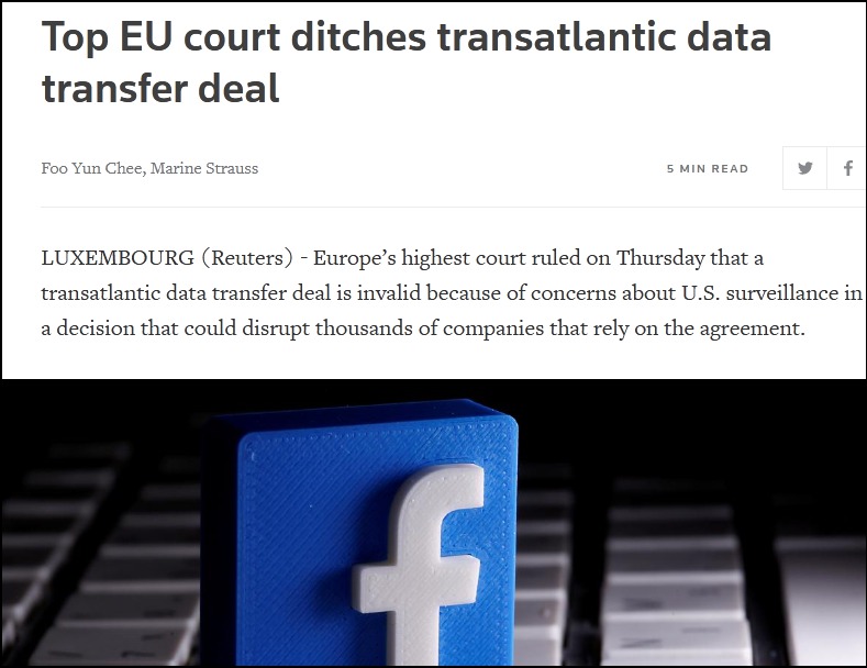路透社當天指出,這一裁決將美國的待遇拉到同非歐盟成員國類似,實際上結束了美國公司在獲取歐盟用户個人數據上的特權。