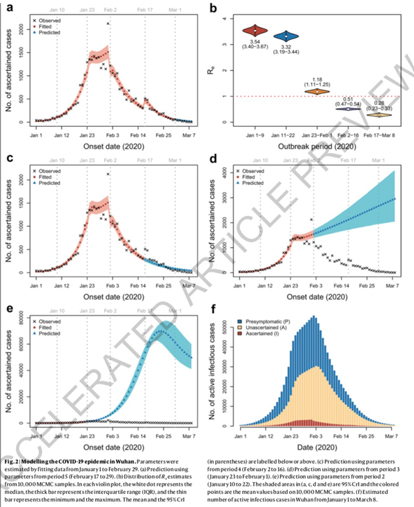 王超龍等人研究了武漢COVID-19暴發的傳播動力學,並利用2019年12月8日至2020年3月8日的32583例實驗室確診病例的數據評估了干預措施的作用。他們利用這些數據模擬了從2020年1月1日開始的疫情,並根據關鍵事件和干預措施分為五個時期,比如農曆新年和實行集中隔離檢疫。