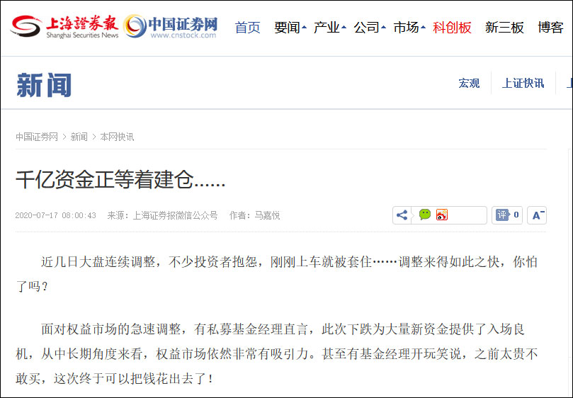 股市大跌後,四大證券報紛紛在7月17日頭版發佈文章認為,短期大跌並不會改變中長期的趨勢,調整或將成為新的入場時機。文章還援引分析指出,政策驅動基本面修復、A股在全球配置吸引力提升、寬鬆的宏觀流動性向股市傳導,三大因素將共同驅動A股上行。