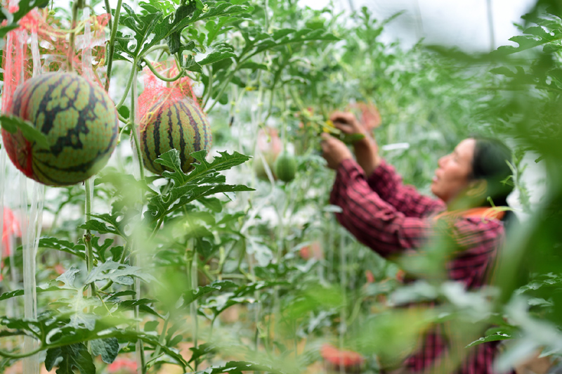 ▲5月7日,在河北省石家莊市靈壽縣三聖院鄉木佛莊園有機蔬菜種植基地,農户在管護大棚西瓜。