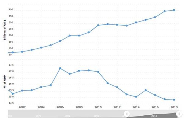2000-2018年間,印度製造業GDP產值及比重[9]