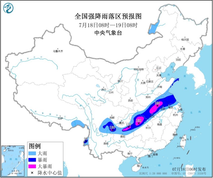 預計,7月18日08時至19日08時,黃淮東部和南部、江淮、江漢南部和東部、湖南北部、西南地區東部、雲南北部等地的部分地區有大到暴雨,其中,安徽中北部、河南東南部、湖北東部和西南部、湖南西北部以及貴州中北部和雲南東北部等地的部分地區有大暴雨(100~180毫米)。上述部分地區伴有短時強降水(最大小時降雨量30~50毫米,局地可超過70毫米),局地有雷暴大風等強對流天氣。