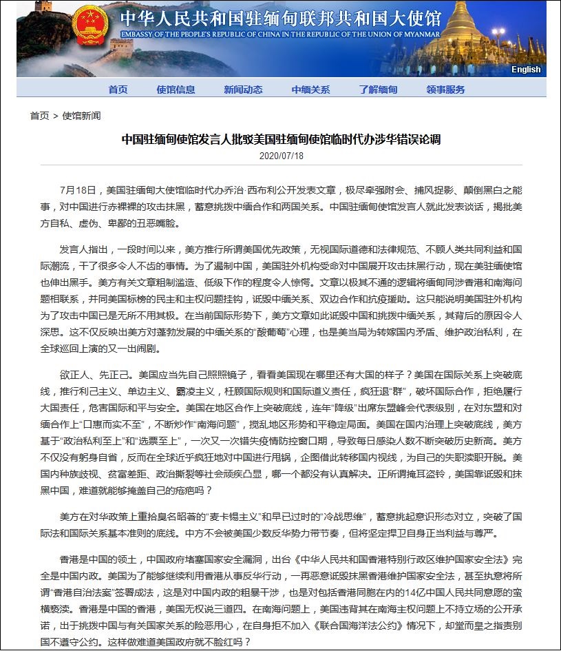 (觀察者網 訊)7月18日,美國駐緬甸大使館公開發表文章,在包括新冠肺炎疫情、中國南海、中國香港,以及中緬關係等問題上,對中國進行赤裸裸的攻擊抹黑。