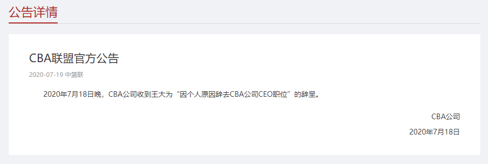7月19日,中國男子籃球職業聯賽(CBA)官方網站發佈公告稱:2020年7月18日晚,CBA公司收到王大為“因個人原因辭去CBA公司CEO職位”的辭呈。