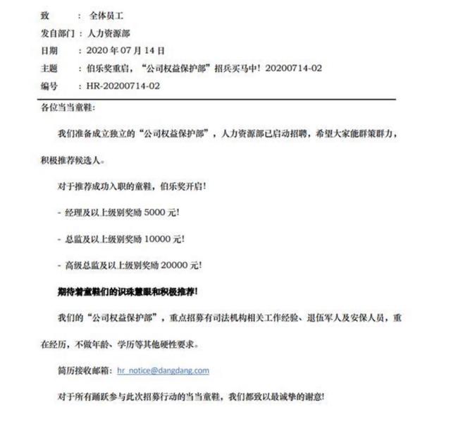 7月17日,一份噹噹網內部郵件在網上流傳。據該內部郵件顯示,噹噹已經成立了獨立的權益保護部,以防範李國慶行政拘留期滿後擾亂公司正常工作秩序的可能。該部門將重點招募有司法機構相關工作經驗、退伍軍人及安保人員,重在經歷,不做年齡、學歷等其他硬性要求。推薦入職還會給員工獎勵。對此,噹噹內部工作人員確認了上述內部郵件的真實性。