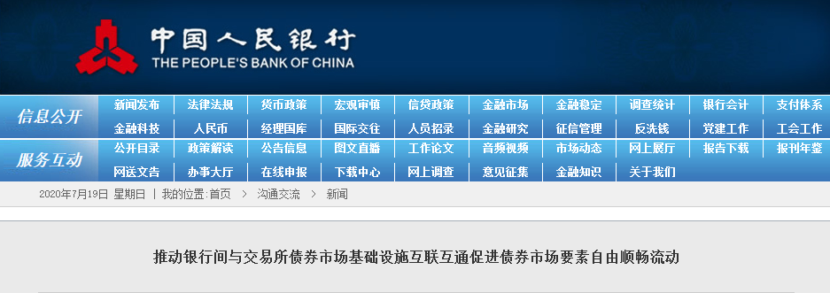 7月19日,中國人民銀行和證監會官網7月19日均發佈消息,為貫徹落實全國金融工作會議關於推進金融基礎設施互聯互通的要求,進一步便利債券投資者,促進我國債券市場高質量發展,近日,人民銀行、證監會聯合發佈《中國人民銀行 中國證券監督管理委員會公告(〔2020〕第7號)》,同意銀行間與交易所債券市場相關基礎設施機構開展互聯互通合作。