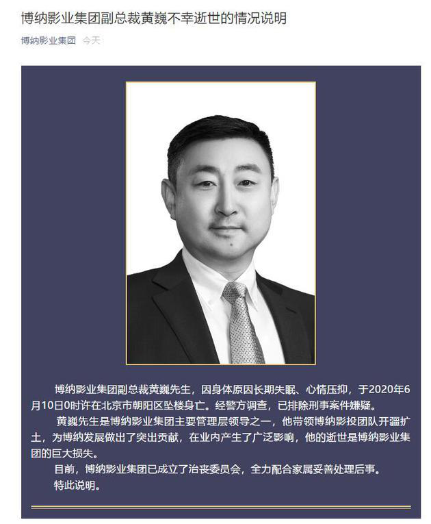 而博納影業集團副總黃巍跳樓自殺,更是為這次疫情期間電影產業的慘痛損失,做了一個很好的註腳。