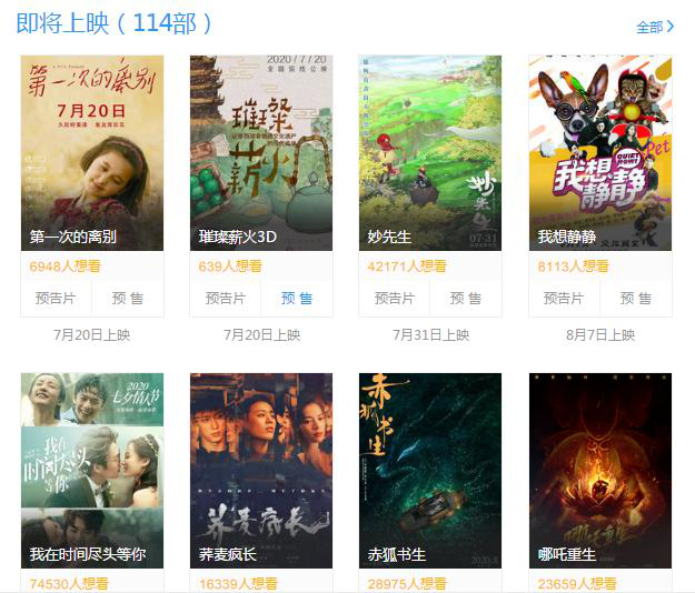 大多數的新片肯定要觀望一段時間,但是也有一些電影,想衝一個開門紅。目前包括《第一次的離別》、《我在時間盡頭等你》等新片已經定檔7月20日上映,不過預售還沒有開啓,尚不知是否能夠按計劃公映。