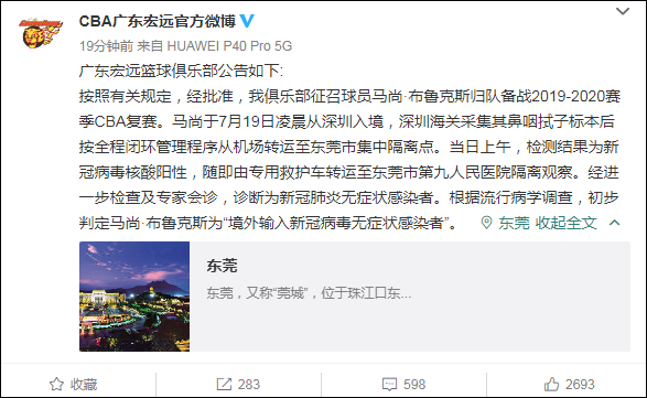 據@CBA廣東宏遠官方微博 7月20日消息,按照有關規定,經批准,我俱樂部徵召球員馬尚·布魯克斯歸隊備戰2019-2020賽季CBA複賽。馬尚於7月19日凌晨從深圳入境,深圳海關採集其鼻咽拭子標本後按全程閉環管理程序從機場轉運至東莞市集中隔離點。當日上午,檢測結果為新冠病毒核酸陽性,隨即由專用救護車轉運至東莞市第九人民醫院隔離觀察。經進一步檢查及專家會診,診斷為新冠肺炎無症狀感染者。根據流行病學調查,初步判定馬尚·布魯克斯為“境外輸入新冠病毒無症狀感染者”。