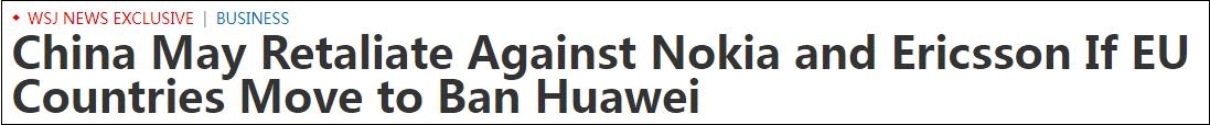 《華爾街日報》獨家報道稱,若歐盟效仿英美禁止華為,那麼中國可能對諾基亞和愛立信進行反擊