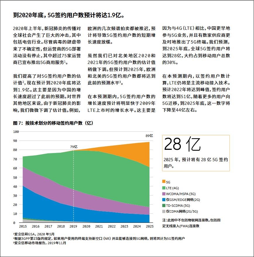 另外,從2019年的5G簽約用户數來看,中國的人數約為500萬人,到2025年愛立信預測這一數字將會增長到10.8億人。相較之下,北美2019年的5G簽約用户數為100萬左右,到2025年預計為3.2億人。全歐2025年的5G簽約用户數為4.5億人。