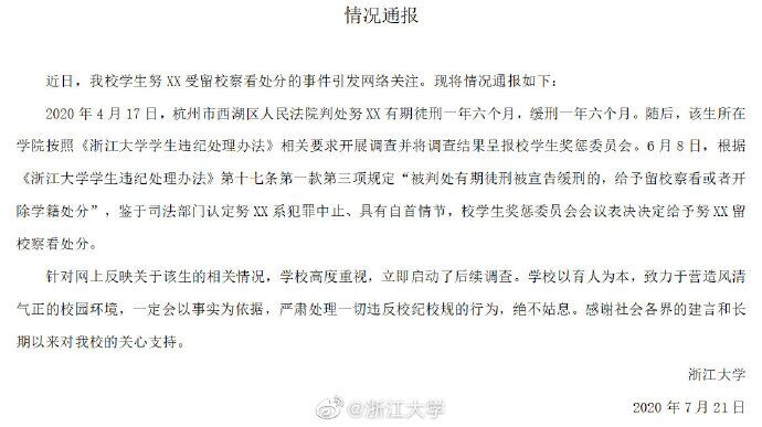 2020年4月17日,杭州市西湖區人民法院判處努XX有期徒刑一年六個月,緩刑一年六個月。隨後,該生所在學院按照《浙江大學學生違紀處理辦法》相關要求開展調查並將調查結果呈報校學生獎懲委員會。6月8日,根據《浙江大學學生違紀處理辦法》第十七條第一款第三項規定“被判處有期徒刑被宣告緩刑的,給予留校察看或者開除學籍處分”,鑑於司法部門認定努XX系犯罪中止、具有自首情節,校學生獎懲委員會會議表決決定給予努XX留校察看處分。