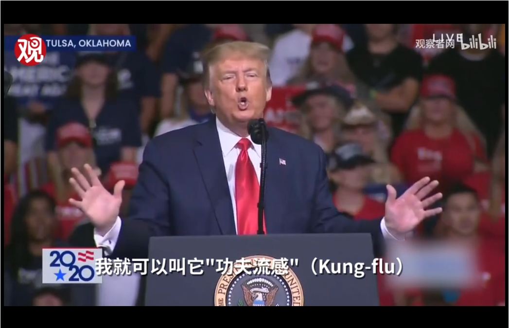 在6月20日的競選集會上,特朗普將新冠肺炎稱作“功夫流感”。該圖為觀察者網視頻截圖