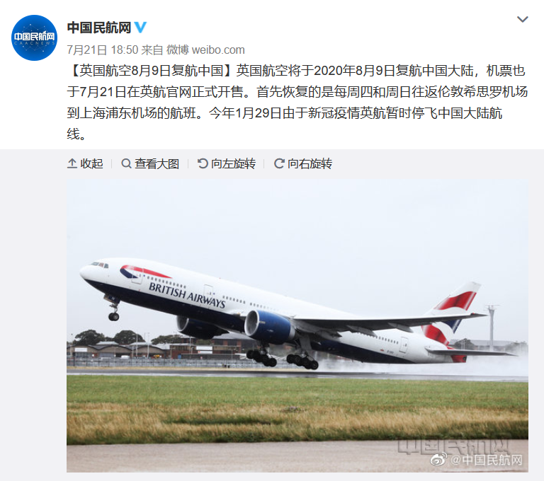 英國航空8月9日復航中國大陸 2020-07-22 英國航空將於2020年8月9日復航中國大陸,機票也於7月21日在英航官網正式開售。首先恢復的是每週四和週日往返倫敦希思羅機場到上海浦東機場的航班。今年1月29日由於新冠疫情英航暫時停飛中國大陸航線。