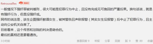“一般情況下強姦罪被判緩刑,很大可能是犯罪行為中止,且沒有完成無可挽回的嚴重後果。換句話説,就是有強姦行為,但是沒強姦成。網傳的説法是,該生企圖強姦醉酒女生,被其警告且聲稱報警(其實女生沒報警)後中止了犯罪行為,且主動向公安機關自首了。目前看來,這個傳言和法院的判決是吻合的。最後的真相還是要看通告。”