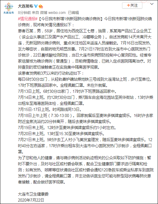 據@大連發布 消息,7月22日,遼寧大連市新增1例本土新冠肺炎確診病例,現將有關情況通報如下: