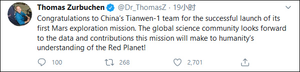 NASA科學任務理事會副局長托馬斯·澤布臣(Thomas Zurbuchen)發推:“祝賀中國首次火星探測任務天問一號成功發射。全球科學界都期盼這次任務能為人類探索這顆紅色星球帶來新的數據和貢獻!”