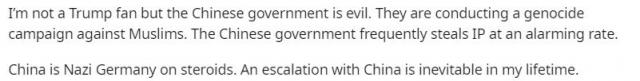 比如像下面這樣把中國比作納粹德國的評論,基本上是歐美網絡上涉華帖子的固定搭配了。