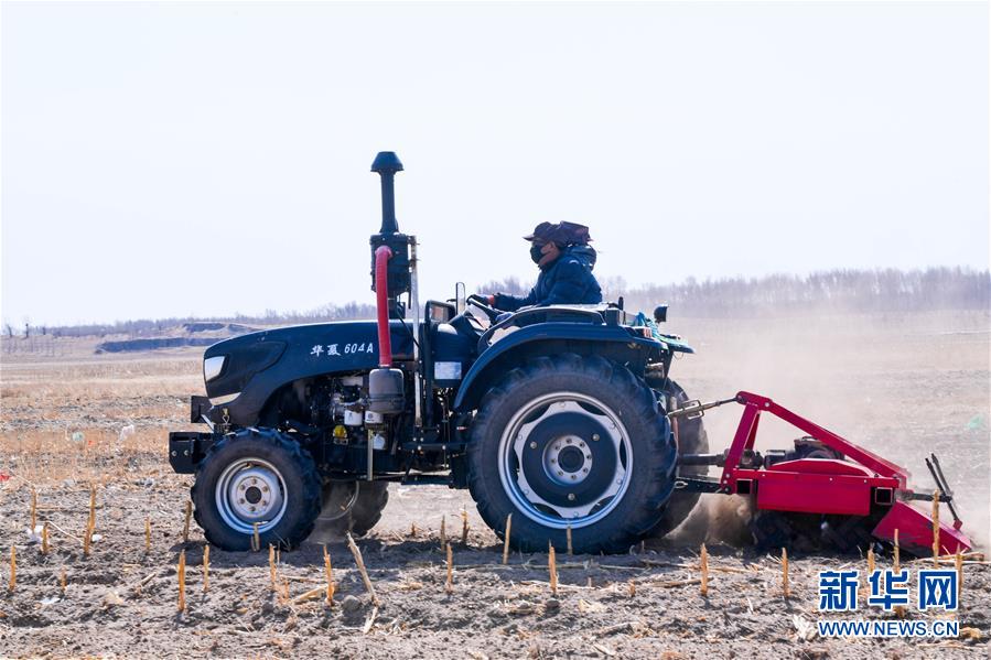吉林省通榆縣邊昭鎮的村民在五井子村原址復墾的農田上犁地(3月31日攝)。 新華社發(顏麟藴 攝)
